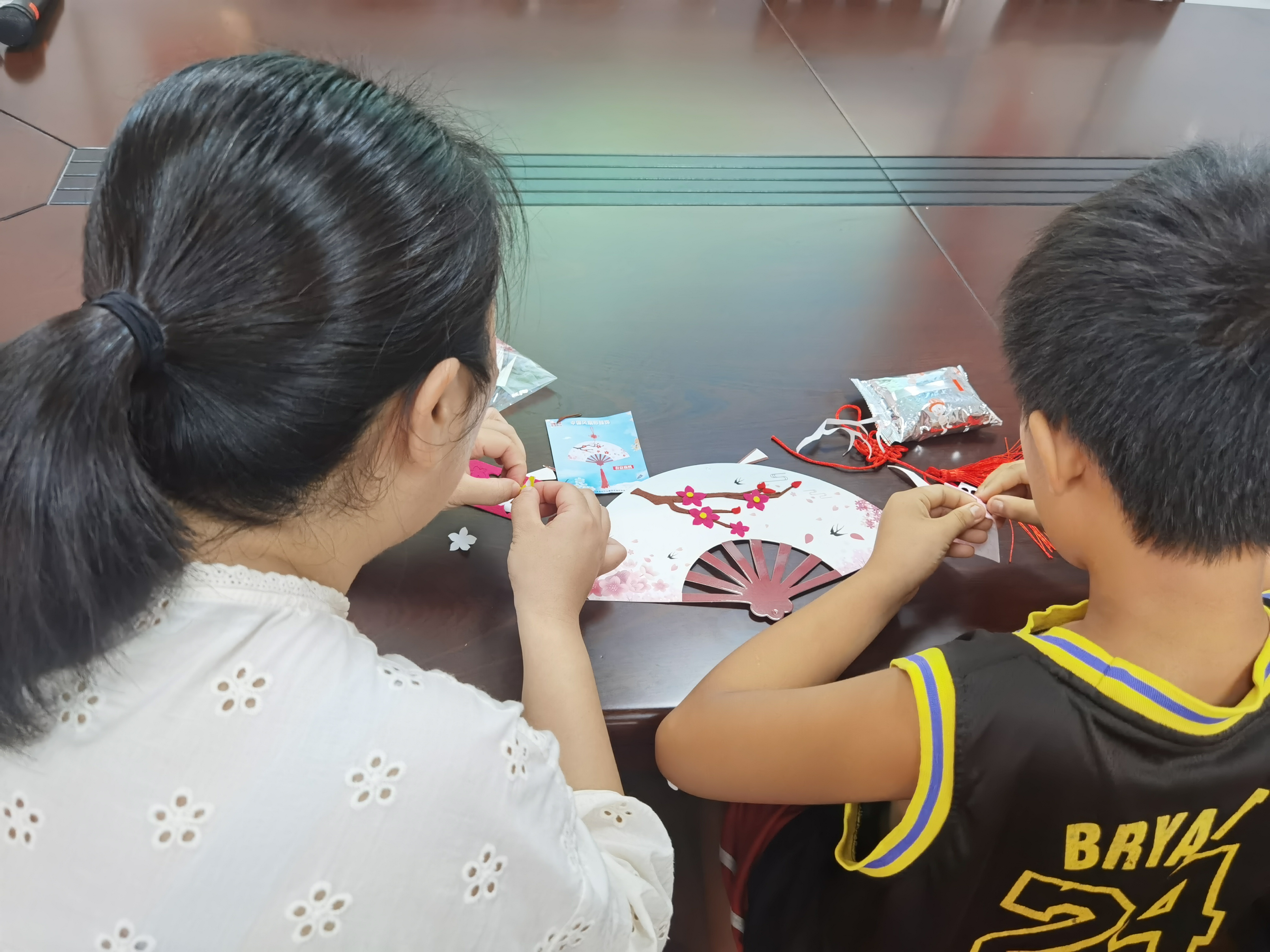 接下來就是孩子們期待的制作手工扇子環(huán)節(jié),年齡小的在家長們的協(xié)助下,認(rèn)真粘貼圖案,一絲不茍地對待每一個(gè)環(huán)節(jié)。經(jīng)過半小時(shí)的創(chuàng)作,一把把空白的扇子在孩子們的手中變得色彩斑斕,孩子們喜悅之情溢于言表。活動(dòng)現(xiàn)場氣氛熱烈,大家追溯著七夕之源,感受著中華優(yōu)秀傳統(tǒng)文化之美,享受著動(dòng)手制作之樂。