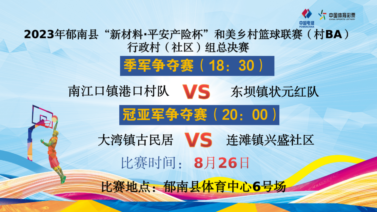 8月26日18:30,2023年郁南縣“新材料·平安產(chǎn)險(xiǎn)杯”和美鄉(xiāng)村籃球聯(lián)賽(村BA)行政村(社區(qū))組決賽將在郁南縣體育中心6號(hào)籃球場(chǎng)精彩上演。冠軍最終花落誰(shuí)家?讓我們拭目以待吧!