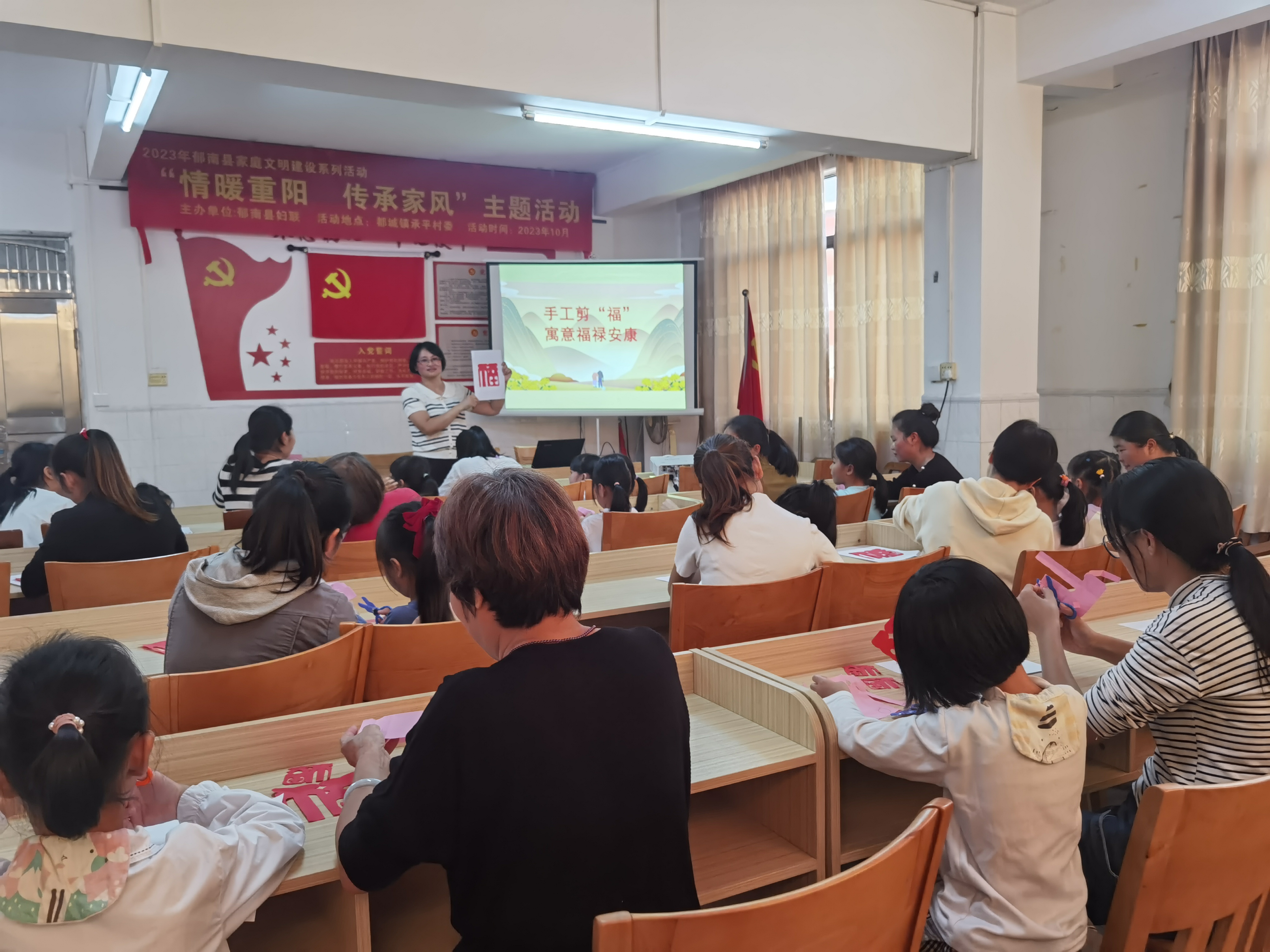首先,婦聯(lián)工作人員以講故事的形式向群眾介紹了重陽節(jié)的登高遠(yuǎn)眺、觀賞菊花、遍插茱萸、吃重陽糕、飲菊花酒等習(xí)俗。接著,通過從中國傳統(tǒng)孝道文化、孝親敬老從我做起兩個方面知識講解,引導(dǎo)青少年學(xué)習(xí)孝道文化,學(xué)會孝敬父母、尊敬長輩,學(xué)會感恩。隨后,組織前來參加活動的群眾開展手工剪紙活動,把祝愿長輩們福祿安康的期盼都融入到了手中的一刀一剪中。一張張紅紙變成了一個個精美的“?!弊肿髌?,看著自己用一把剪刀、一雙巧手制作出的作品,小朋友們由衷領(lǐng)略到尊老愛老的開心快樂。