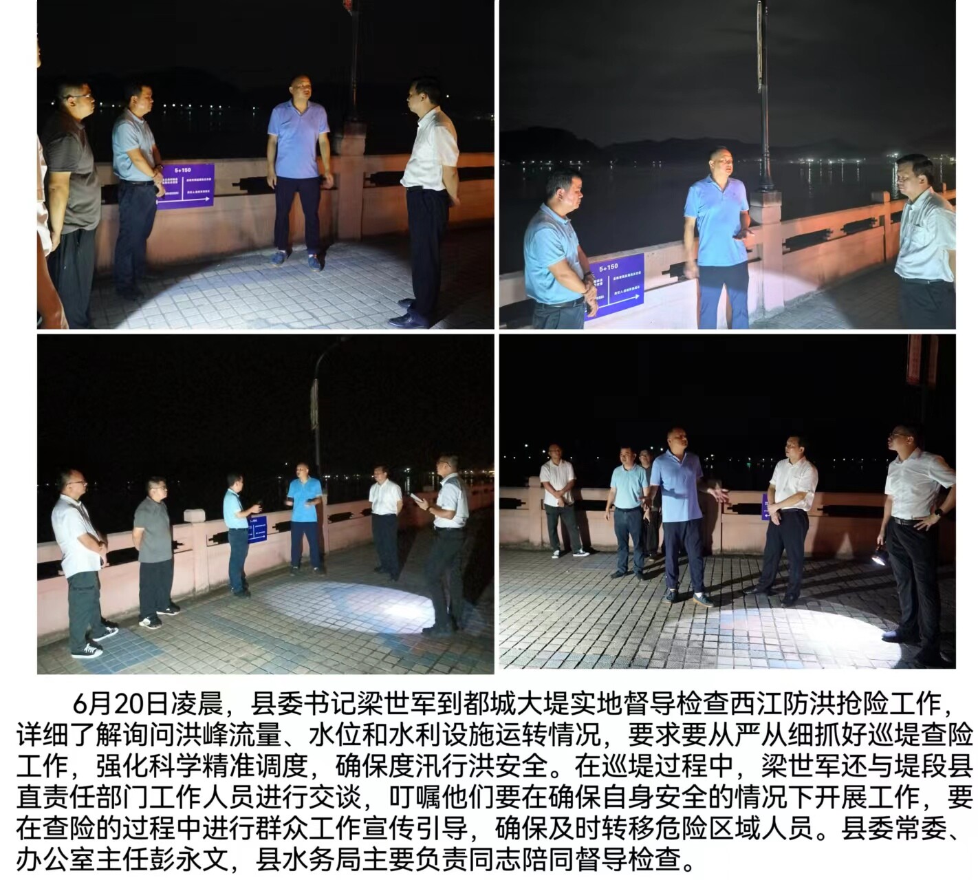 “盯”責(zé)任。對(duì)西江沿岸的堤圍、水閘、電排站等水利工程進(jìn)行防洪安全檢查,壓實(shí)層級(jí)行政、技術(shù)等相關(guān)責(zé)任人的防汛崗位責(zé)任,強(qiáng)化沿西江水利工程安全運(yùn)行管理的指導(dǎo)督導(dǎo),確保防御措施、應(yīng)急人員、防汛物資“三到位”。6月20日凌晨,西江水位達(dá)19.15米,由縣城各責(zé)任單位組成的巡查隊(duì)伍聞令而動(dòng),迅速集結(jié)西江大堤,縣主要領(lǐng)導(dǎo)實(shí)地指導(dǎo)開展巡堤工作。