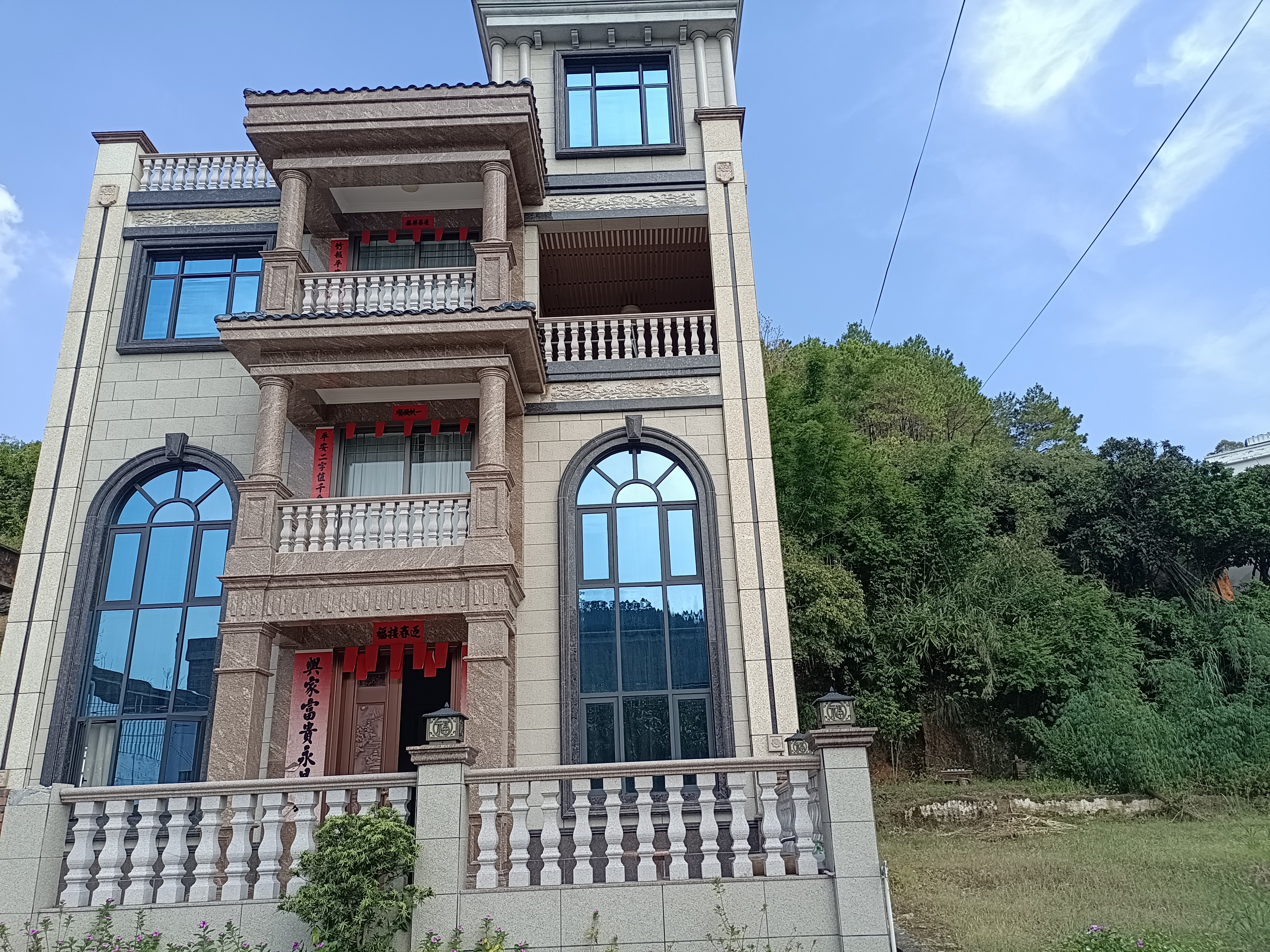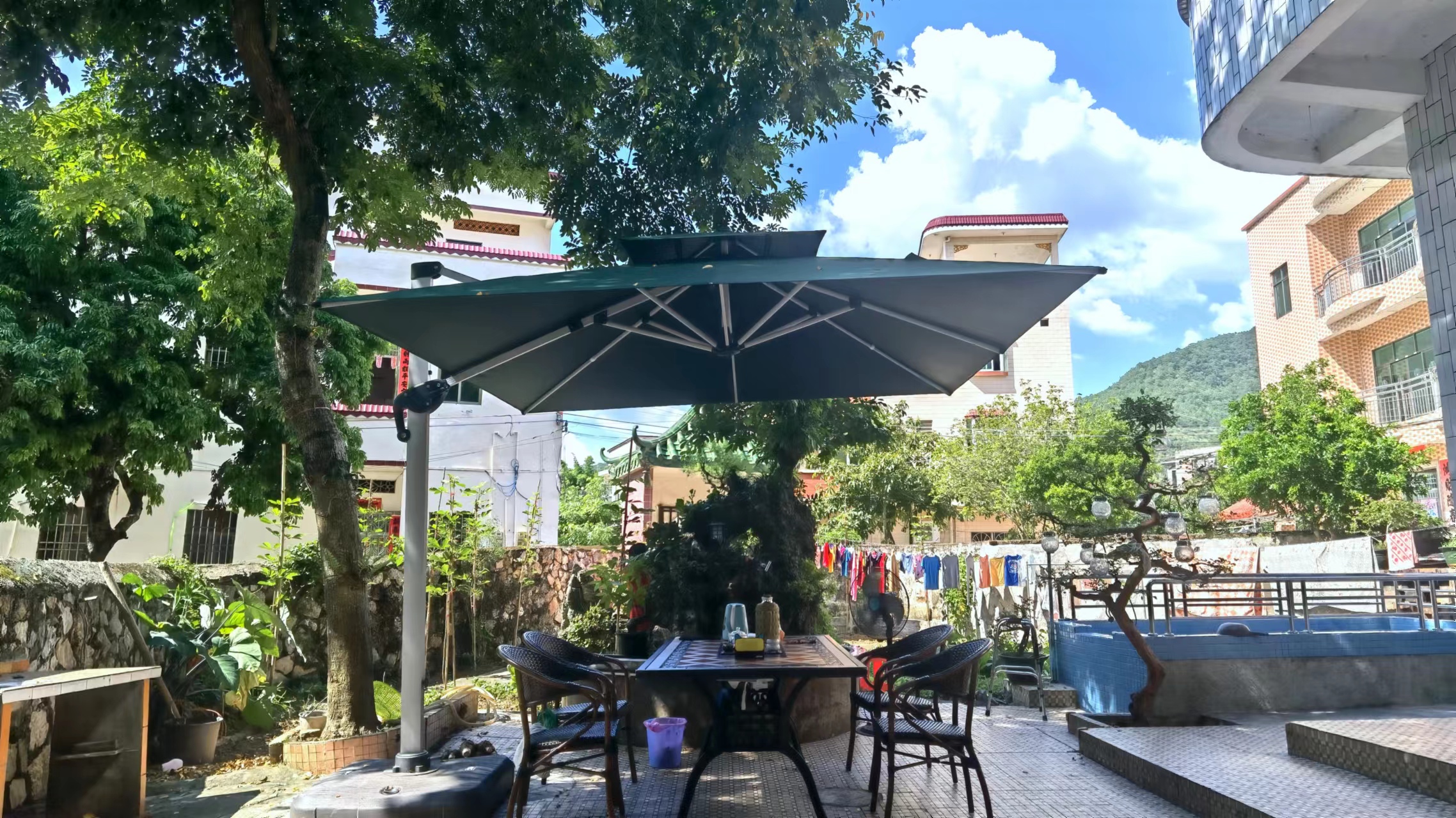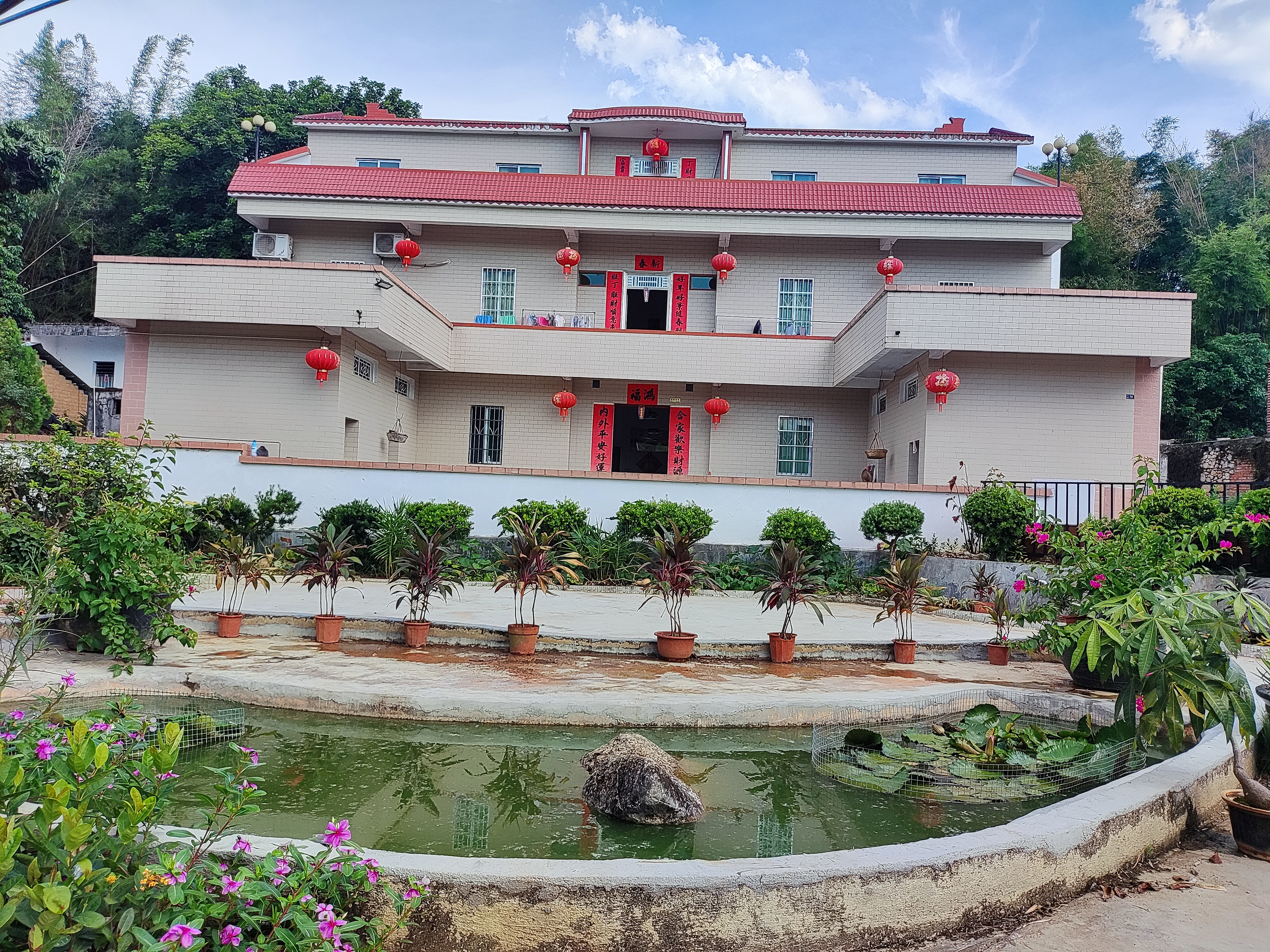 位于東壩鎮(zhèn)虎巖墩仔村林彩容家三層小屋頂亭臺,兩座假山繞曲徑?;ɡ鏋閭?,天水為池,家里的庭院,是彩姐夫妻二人親手打造的,一磚一瓦、一草一木,不曾假手于人。在彩姐的庭院里,春至細雨如絲,鳥語花香;夏則傍流水亭軒,艷陽高照;秋來隔窗聽雨,小扇撲螢;冬可踏霜曬暖,聆暗香遁地。看門前那副有著30年歷史的對聯(lián):觀青山明堂水繞,跟時勢向前發(fā)展??梢钥闯鑫覀兊耐ピ海窃谌Υ蛟焐鐣髁x新農(nóng)村的一個縮影,體現(xiàn)出在黨的領(lǐng)導(dǎo)下,人民群眾的生活水平蒸蒸日上。