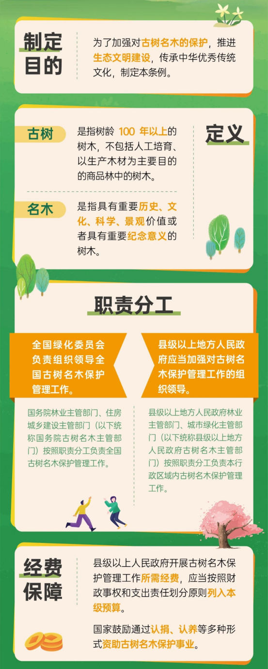 3月15日起,《古樹名木保護(hù)條例》施行。這是我國首次以行政法規(guī)的形式明確了開展古樹名木保護(hù)管理工作應(yīng)遵守的法律規(guī)定,填補(bǔ)了我國古樹名木保護(hù)領(lǐng)域的法規(guī)空白,為我國古樹名木保護(hù)事業(yè)高質(zhì)量發(fā)展提供了堅實的法治保障。