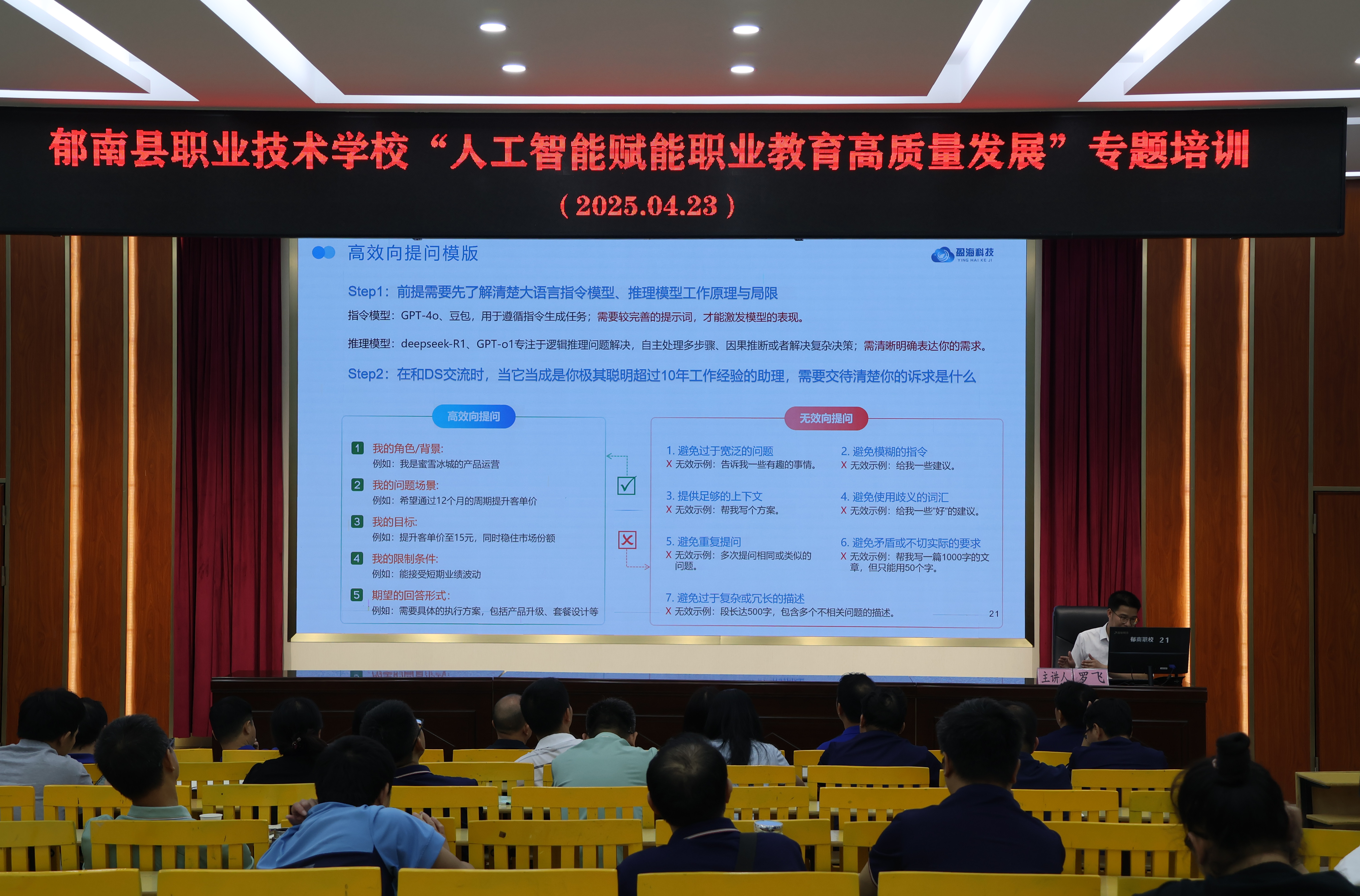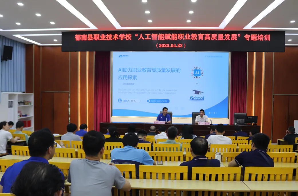 2025年4月23日下午,郁南縣職業(yè)技術(shù)學(xué)校成功舉辦了“人工智能賦能職業(yè)教育高質(zhì)量發(fā)展”專題培訓(xùn)。本次講座由人工智能專家羅飛主講,學(xué)校黨委書記陳永明主持,全體教師積極參與,共同探討AI技術(shù)在職業(yè)教育中的創(chuàng)新應(yīng)用與發(fā)展前景。