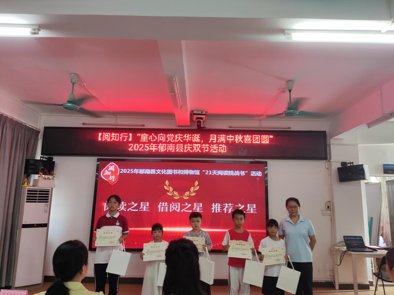 金秋十月,家國同慶。2025年10月1日上午10時,由中共郁南縣委宣傳部、郁南縣文化廣電旅游體育局主辦,郁南縣文化圖書和博物館承辦的“童心向黨慶華誕,月滿中秋喜團圓”雙節(jié)慶?;顒?,在郁南縣圖書館四樓溫情落幕?;顒右浴皞鞒袀鹘y(tǒng)文化、厚植家國情懷”為主線,通過“頒獎、誦讀、親子手工”三大環(huán)節(jié),融合書香雅韻與節(jié)日氛圍,為現(xiàn)場親子家庭呈現(xiàn)了一場意蘊深厚的文化體驗,收獲了廣泛好評。