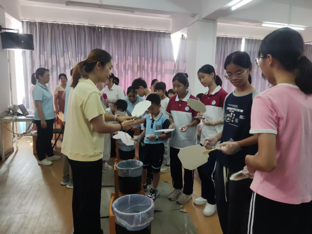 中秋寄情,團扇繪意?;顒訅狠S環(huán)節(jié)是充滿傳統(tǒng)韻味的漆扇親子手作。工作人員提前備好素面團扇、環(huán)保漆料與畫筆,在工作人員引導(dǎo)下,家長與孩子共同體驗滴漆、入水、轉(zhuǎn)紋、晾干等工序。孩子們創(chuàng)意飛揚,家長耐心協(xié)助,場面溫馨熱烈。當一把把獨一無二的古風(fēng)團扇在親子合作中誕生,喜悅與自豪洋溢在每個人的笑臉上。