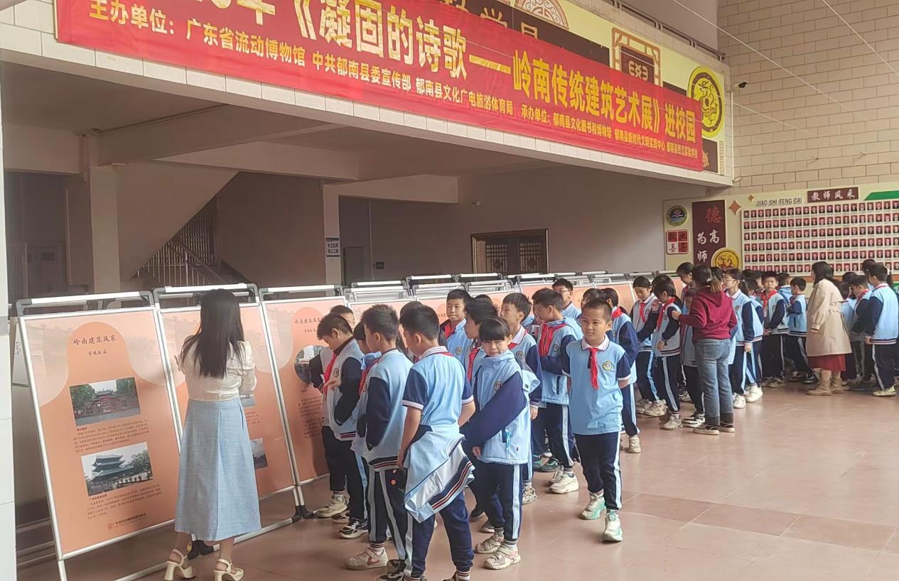 近日,由廣東省流動博物館、中共郁南縣委宣傳部郁南縣文化廣電旅游體育局主辦,郁南縣文化圖書和博物館、郁南縣新時代文明實踐中心、郁南縣西江實驗學校共同承辦的《凝固的詩歌——嶺南傳統(tǒng)建筑藝術(shù)圖片展》《探尋“最早廣東人”——磨刀山遺址圖片展》走進校園。