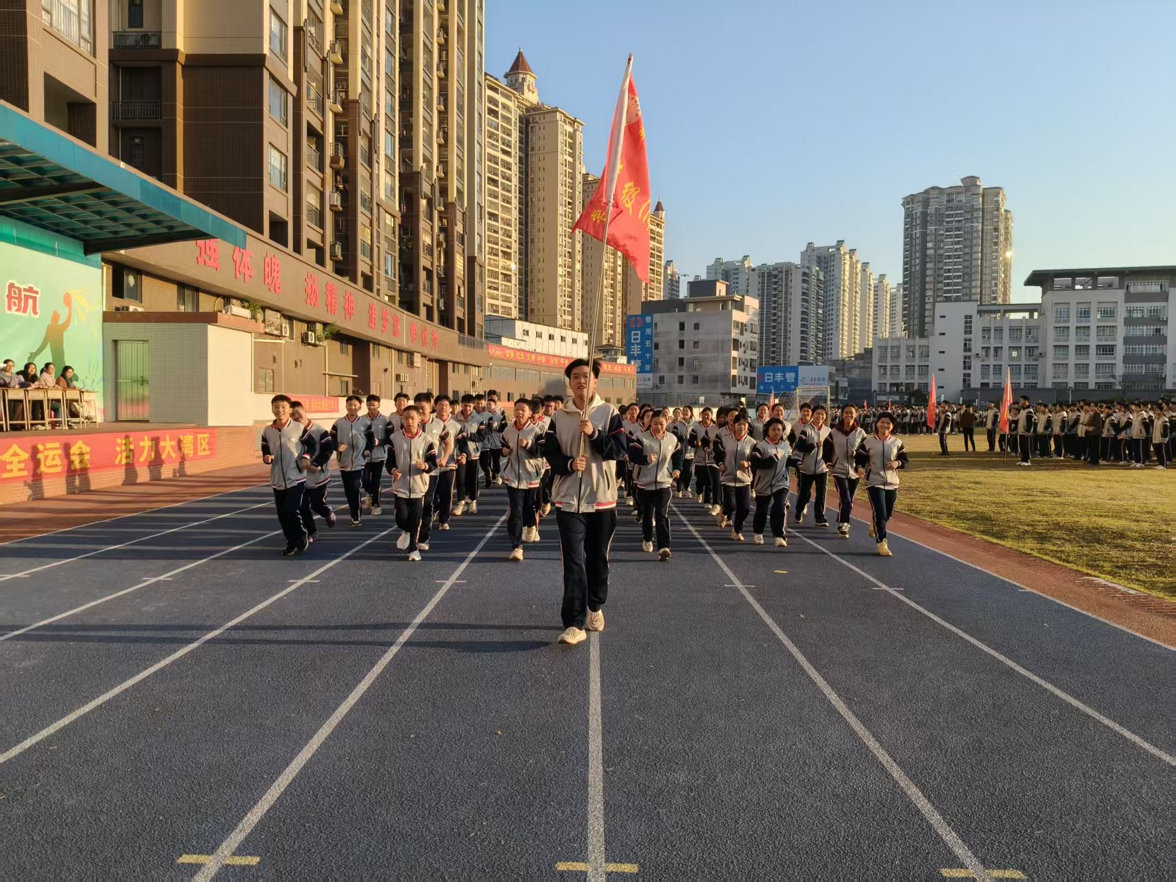 活動(dòng)伊始,主持人首先闡述了本次大賽的意義,強(qiáng)調(diào)這是對(duì)落實(shí)“每天運(yùn)動(dòng)不少于兩小時(shí)”要求的一次集中檢閱,鼓勵(lì)各班賽出風(fēng)格、賽出水平,充分展現(xiàn)實(shí)中學(xué)子的精神風(fēng)貌。 隨著比賽指令下達(dá),16個(gè)依抽簽順序出場(chǎng)的班級(jí),在運(yùn)動(dòng)場(chǎng)上完美展現(xiàn)了日常鍛煉的扎實(shí)成果。整個(gè)比賽環(huán)節(jié),從候場(chǎng)、入場(chǎng)到跑操全過程,秩序井然,氣勢(shì)如虹。同學(xué)們步伐鏗鏘,隊(duì)形緊湊,此起彼伏的創(chuàng)意口號(hào)更是展現(xiàn)了各班的獨(dú)特風(fēng)采與昂揚(yáng)斗志。 全部班級(jí)比賽完畢后,該校校長作總結(jié)發(fā)言。他對(duì)同學(xué)們展現(xiàn)出的高昂斗志和卓越風(fēng)采給予高度贊揚(yáng),強(qiáng)調(diào)跑操作為每日體育活動(dòng)的重要組成部分,與體育課、大課間等共同構(gòu)筑了學(xué)生每日鍛煉的堅(jiān)實(shí)保障,鼓勵(lì)全體同學(xué)將跑操中展現(xiàn)的激情與活力保持下去,貫穿到每日的體育鍛煉和學(xué)習(xí)生活中。 學(xué)校將以此次活動(dòng)為契機(jī),進(jìn)一步優(yōu)化每日體育活動(dòng)的內(nèi)容與形式,堅(jiān)決保障學(xué)生每日兩小時(shí)的鍛煉時(shí)間與效果,深化體教融合,為培養(yǎng)身心和諧、全面發(fā)展的新時(shí)代少年奠定堅(jiān)實(shí)基礎(chǔ)。