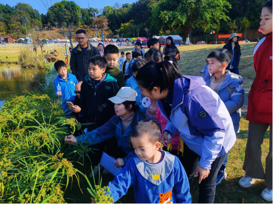 在“濕地實(shí)地探索”環(huán)節(jié),講解員帶領(lǐng)親子家庭沿西寧湖步道徒步,沿途講解濕地的生態(tài)特征,并引導(dǎo)觀察積雪草、落羽杉、風(fēng)車草等典型濕地植物。