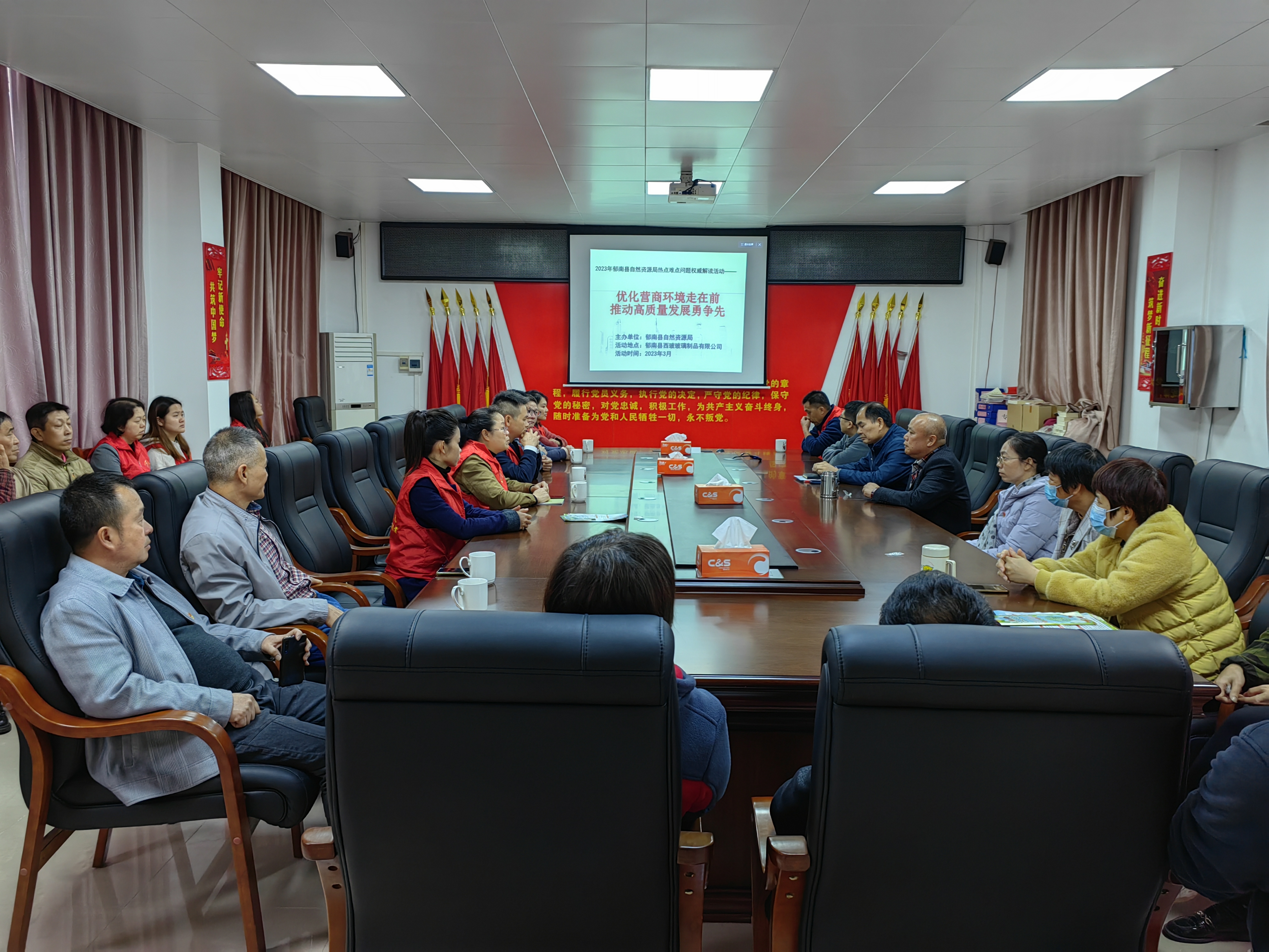 3月28日,在黨委副書記陳恒馨、梅樹禧的帶領(lǐng)下,縣自然資源局黨員干部及股室志愿者共15人前往郁南縣西玻玻璃制品有限公司二樓黨建活動室開展主題為“優(yōu)化營商環(huán)境走在前 推動高質(zhì)量發(fā)展勇爭先”熱點問題權(quán)威解讀活動。縣西玻玻璃制品有限公司黨支部黨員參加了活動。