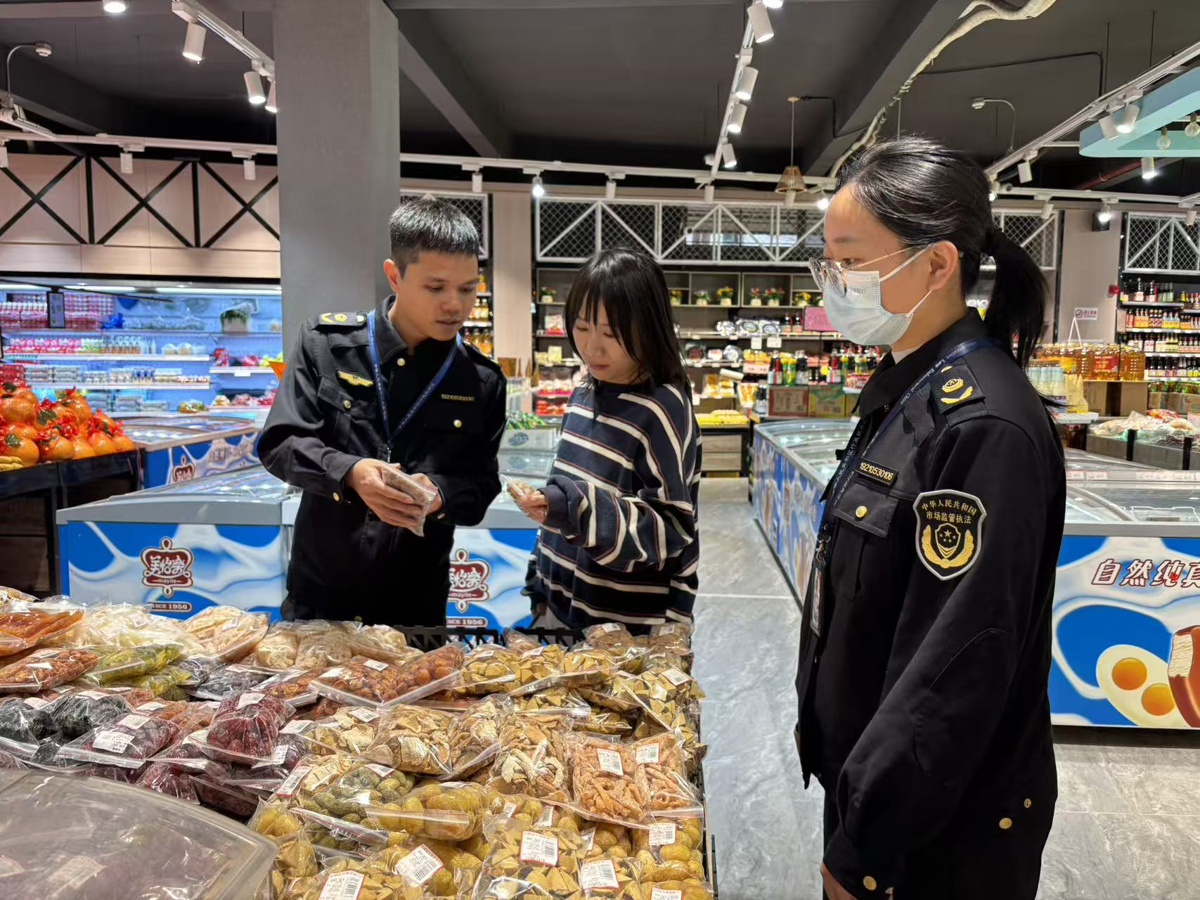 檢查組在各大超市檢查組聚焦群眾“菜籃子”“米袋子”“果盤(pán)子”,對(duì)節(jié)日熱銷(xiāo)品類(lèi)開(kāi)展全面排查。執(zhí)法人員逐一查看糧油米面、酒水飲料、糕點(diǎn)糖果、散裝食品等商品,仔細(xì)核對(duì)生產(chǎn)日期、保質(zhì)期、儲(chǔ)存條件,嚴(yán)查過(guò)期變質(zhì)、假冒偽劣、“三無(wú)”(無(wú)生產(chǎn)日期、無(wú)質(zhì)量合格證、無(wú)生產(chǎn)廠家)食品,重點(diǎn)檢查冷鏈?zhǔn)称愤M(jìn)貨查驗(yàn)、溯源記錄及儲(chǔ)存溫度,規(guī)范冷鏈?zhǔn)称啡鞒坦芸?;同時(shí),核查商品明碼標(biāo)價(jià)情況,嚴(yán)厲打擊哄抬物價(jià)、價(jià)格欺詐等違法行為,保障節(jié)日市場(chǎng)價(jià)格穩(wěn)定。