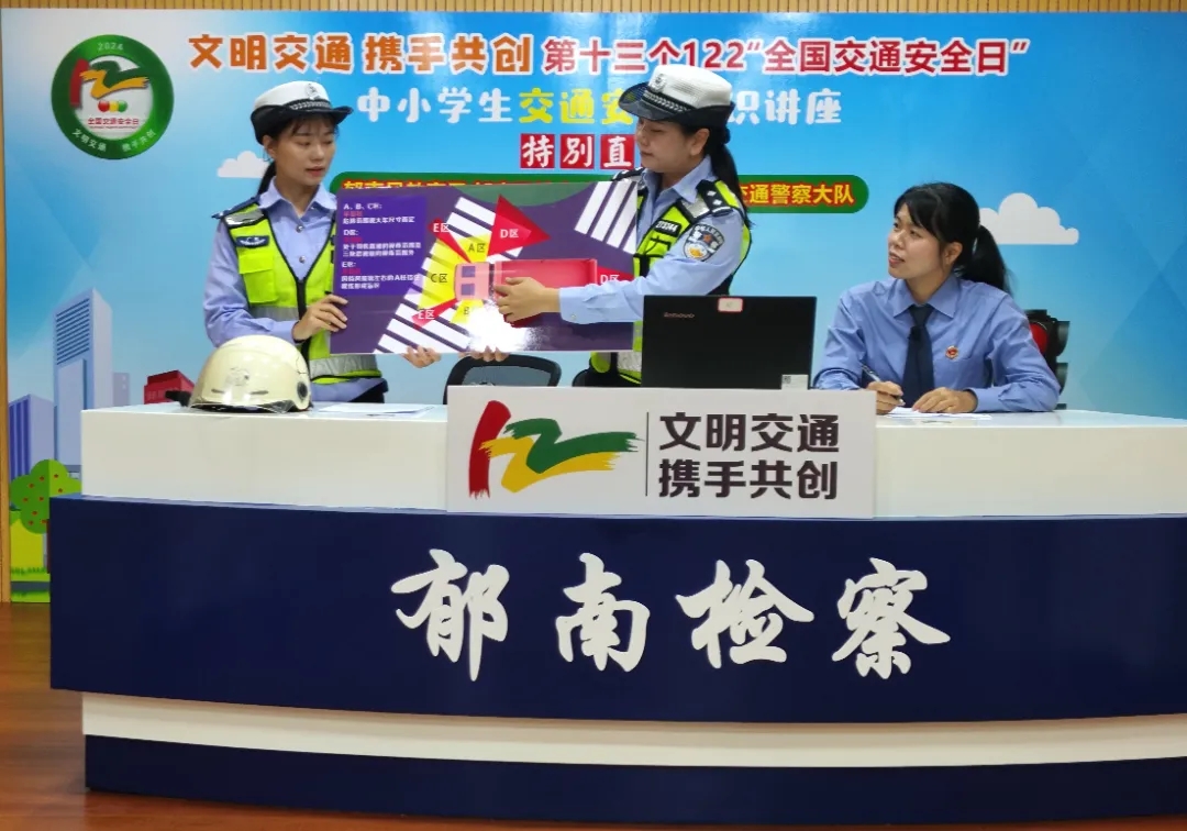 道路千萬(wàn)條,安全第一條。交通安全系著千萬(wàn)家,文明、安全、有序的交通環(huán)境需要你我共同維護(hù)與營(yíng)造。12月2日是第十三個(gè)全國(guó)交通安全日。為切實(shí)提升廣大師生和家長(zhǎng)交通安全意識(shí),防范道路交通事故發(fā)生,郁南縣人民檢察院攜手郁南縣公安局交警大隊(duì)特別策劃了一場(chǎng)交通安全法治宣傳活動(dòng),邀請(qǐng)了縣交警大隊(duì)2名警官走進(jìn)“郁檢藍(lán)普法”直播間,以“知危險(xiǎn)會(huì)避險(xiǎn)”為題,為大家?guī)?lái)了一堂生動(dòng)而實(shí)用的交通安全法治教育課。