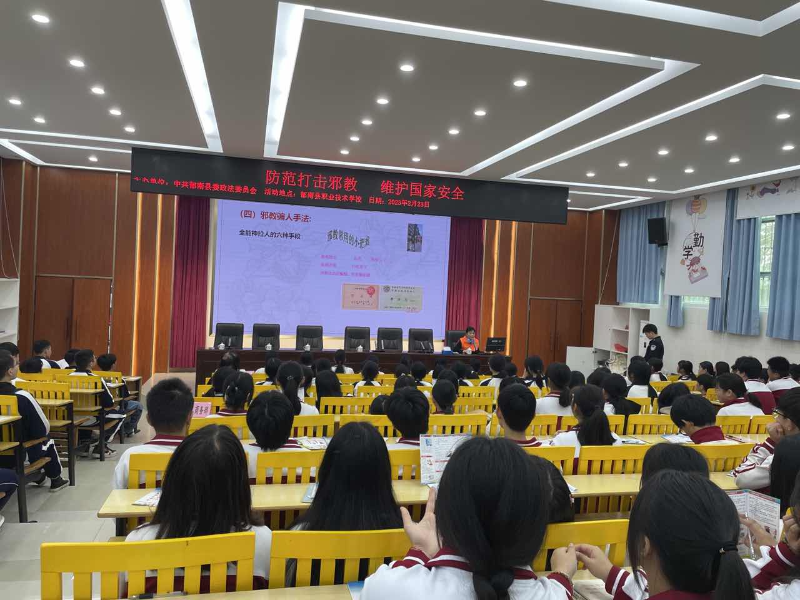 為全面貫徹落實(shí)總體國家安全觀,引導(dǎo)青少年牢固樹立國家安全意識,形成崇尚科學(xué)、反對邪教的健康理念,2月23日,郁南縣委政法委在郁南縣職業(yè)技術(shù)學(xué)校開展反邪教宣傳教育系列活動。