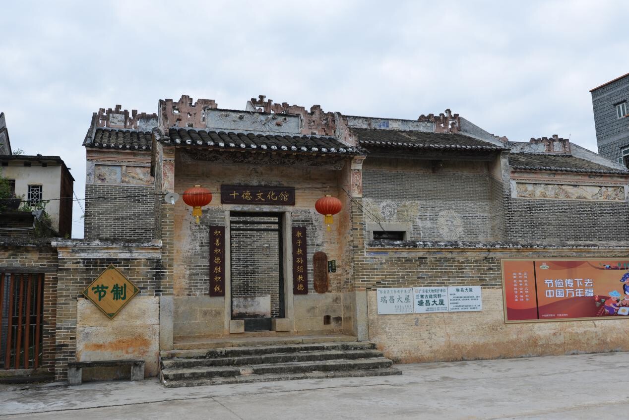 瑞昌大屋(十德文化館)。十德弟又叫瑞昌大屋,是蘭寨建筑之魂。為了弘揚(yáng)優(yōu)秀傳統(tǒng)文化、林氏十德和家訓(xùn),2013年建成十德文化館。林氏十德與新時(shí)期廣東精神、云浮精神一脈相承?!敖套咏虒O須教德,積善積德勝積錢”此聯(lián)是林氏教育后人的最好詮釋。屋檐上的木雕花了工匠六年時(shí)間雕刻而成,藝術(shù)價(jià)值極高。