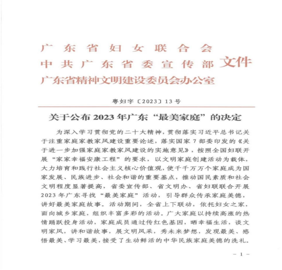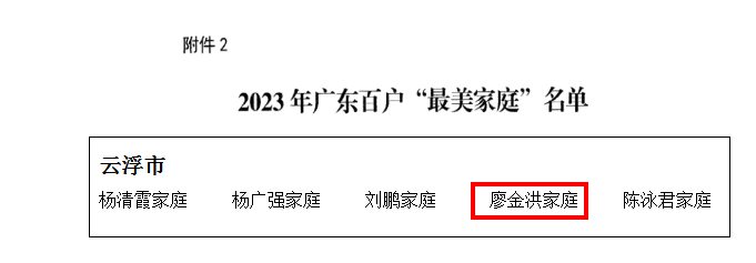 根據(jù)省婦聯(lián)、省委宣傳部和省文明辦《關(guān)于公布2023年廣東“最美家庭”的決定》,我市有5戶家庭獲評2023年廣東百戶“最美家庭”,其中,我縣廖金洪家庭獲選。