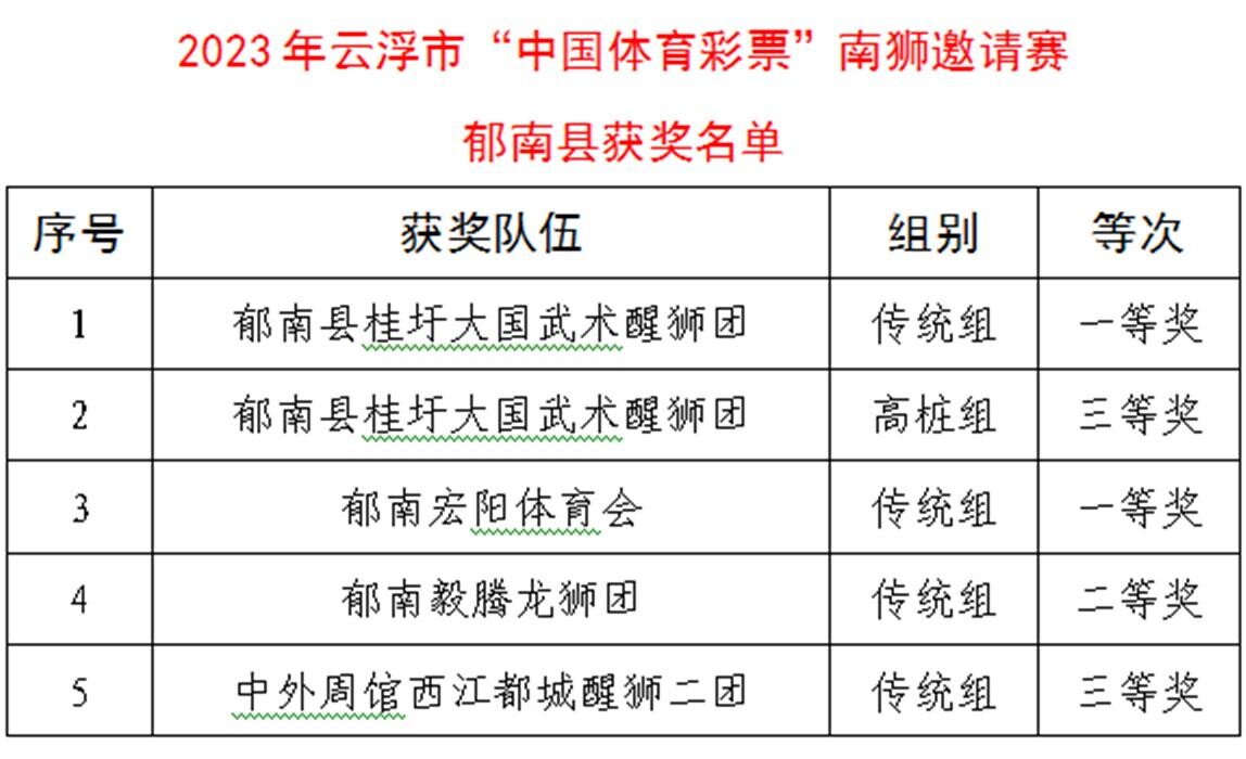 近日,由云浮市文化廣電旅游體育局主辦、云浮市龍獅運(yùn)動(dòng)協(xié)會(huì)承辦的2023年云浮市“中國(guó)體育彩票”南獅邀請(qǐng)賽在云浮市體育公園成功舉辦,郁南縣龍獅運(yùn)動(dòng)協(xié)會(huì)組織郁南縣桂圩大國(guó)武術(shù)醒獅團(tuán)、郁南宏陽(yáng)體育會(huì)、郁南毅騰龍獅團(tuán)、中外周館西江都城醒獅二團(tuán)4支隊(duì)伍參賽,載譽(yù)歸來。