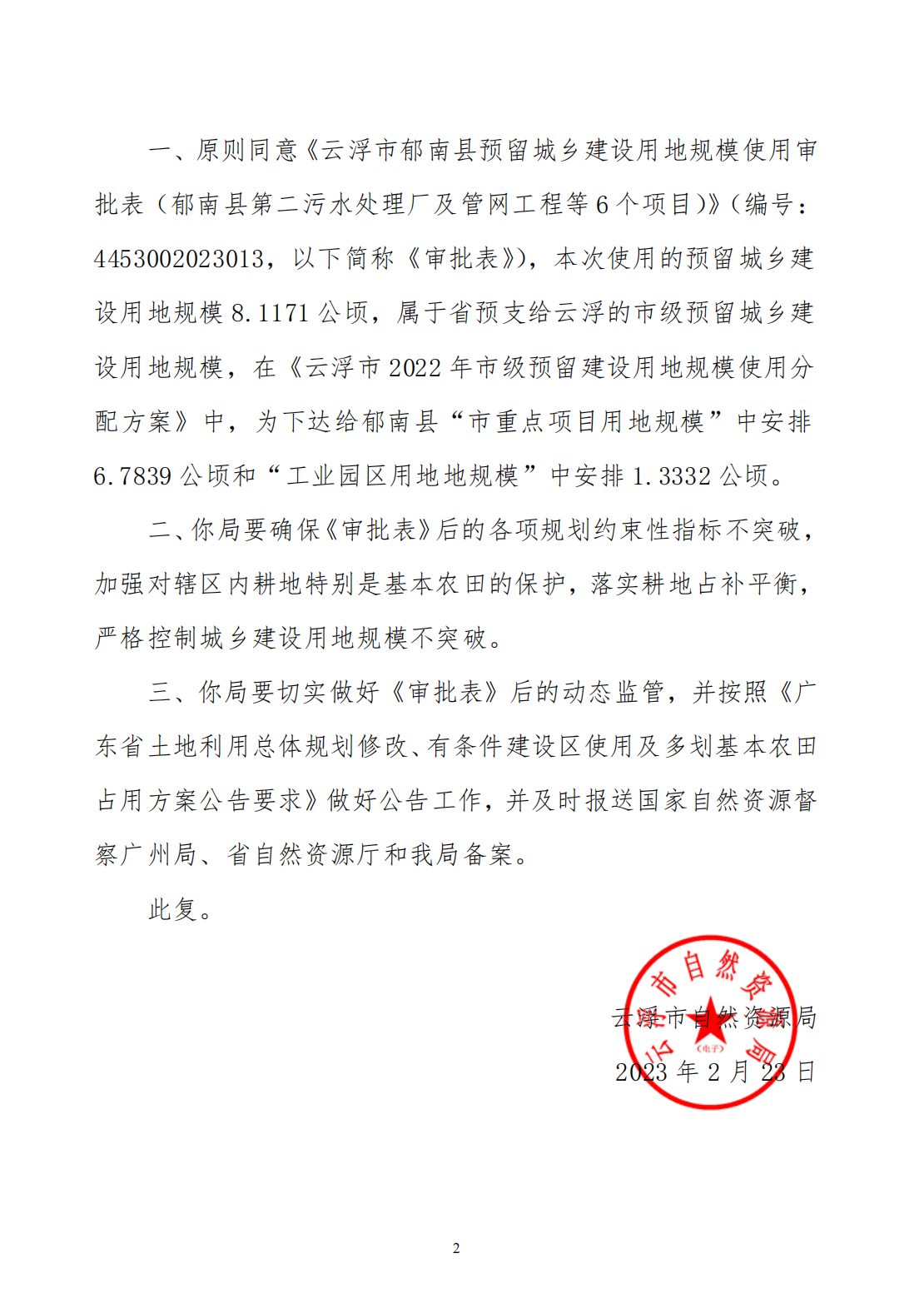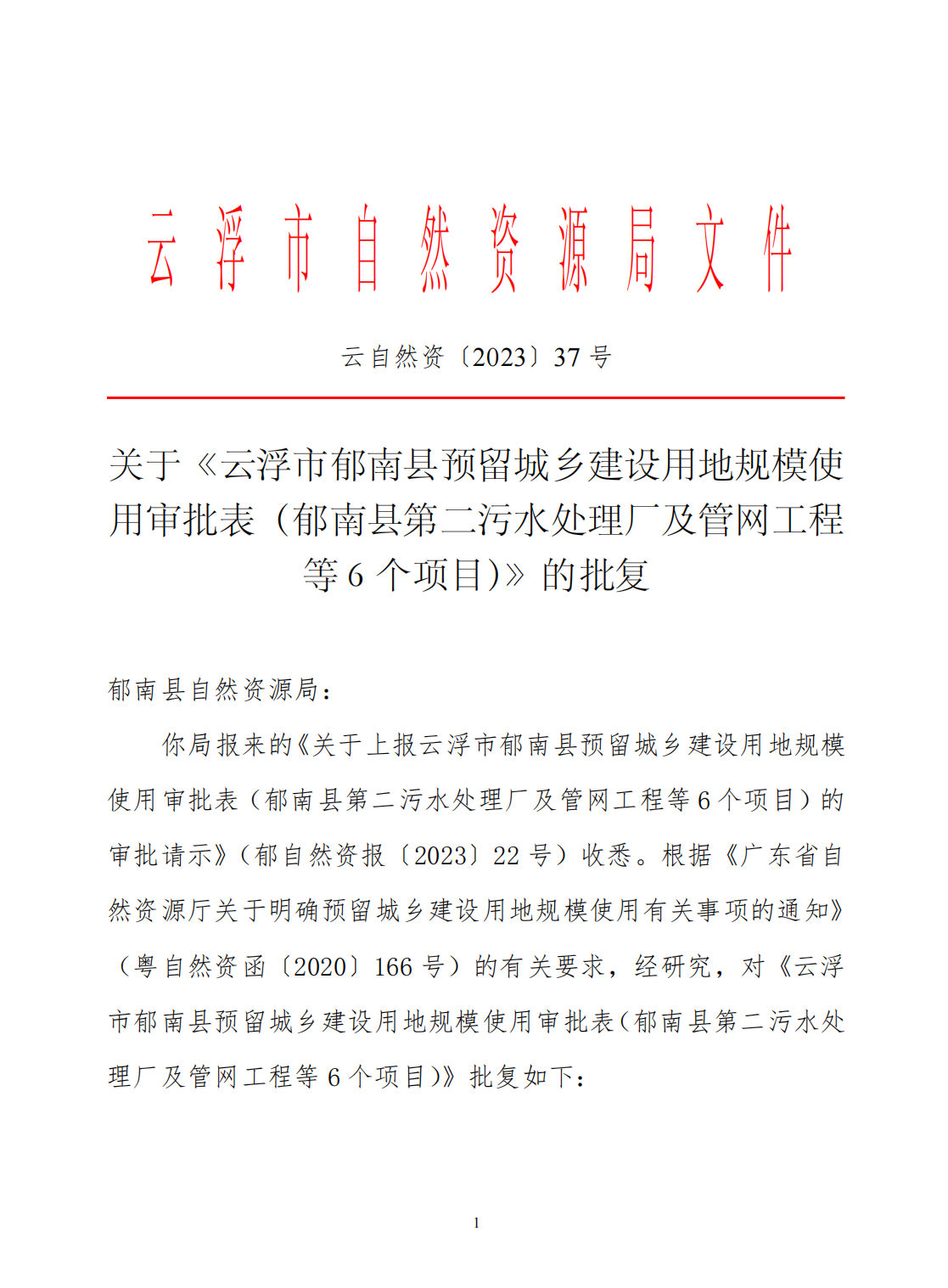 關(guān)于《云浮市郁南縣預(yù)留城鄉(xiāng)建設(shè)用地規(guī)模使用審批表(郁南縣第二污水處理廠及管網(wǎng)工程等6個(gè)項(xiàng)目)》的批復(fù)(云自然資〔2023〕37號(hào))。
