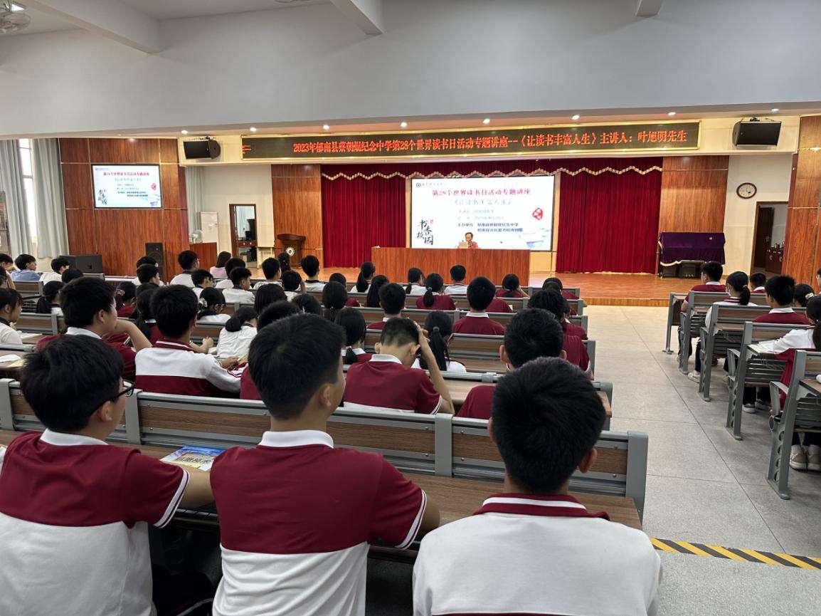 為進(jìn)一步落實“書香校園”建設(shè),深入推進(jìn)郁南縣文化圖書和博物館與郁南縣蔡朝焜紀(jì)念中學(xué)文化共建活動,4月21日下午,郁南縣蔡朝焜紀(jì)念中學(xué)舉辦了第28個世界讀書日活動專題講座,邀請了中國民俗學(xué)會、中國楹聯(lián)學(xué)會、廣東省作家協(xié)會、省民間文藝家協(xié)會會員、原郁南縣文史科科長葉旭明先生為學(xué)生們開展一場以“讓讀書豐富人生”為主題的專題講座。郁南縣文化圖書和博物館館長朱曉樺女士,郁南縣文化圖書和博物館副館長、縣非遺中心主任潘媚女士,郁南縣蔡朝焜紀(jì)念中學(xué)彭燕飛校長,陳演年副校長,教務(wù)處王賢杰主任以及各年級學(xué)生代表共800多人出席了本次活動。通過葉旭明先生的講座,伴隨著郁南縣文化圖書和博物館與郁南縣蔡朝焜紀(jì)念中學(xué)的文化共建,激發(fā)了廣大青少年,多讀書、讀好書,養(yǎng)成良好的讀書習(xí)慣,為個人成長,家鄉(xiāng)發(fā)展,祖國進(jìn)步奉獻(xiàn)力量。