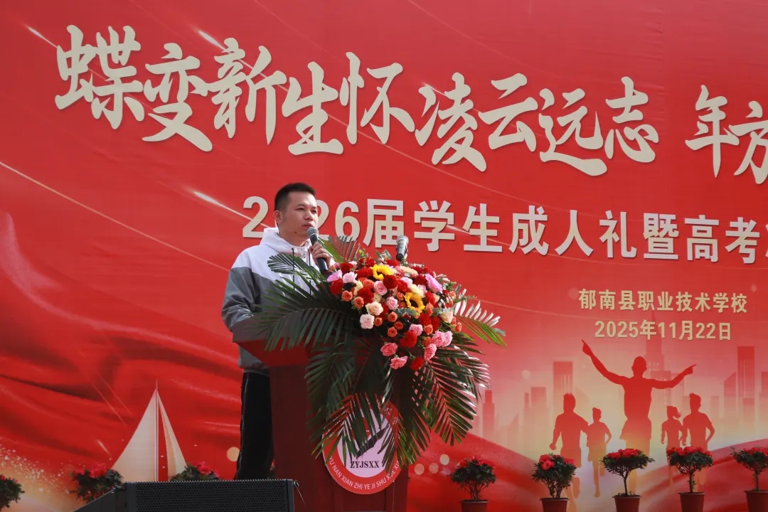 溫伯榮副縣長結合自身經歷,對學子深切寄語。他勉勵學子“立鴻鵠之志,涵養(yǎng)家國情懷,將個人理想融入國家發(fā)展大局,樹立技能報國、實干興邦的志向”,鼓勵他們努力學習,以昂揚姿態(tài)迎接職教高考最后50天,學有所成后報效祖國、投身“百千萬工程”建設;同時強調職業(yè)教育是推動縣域經濟高質量發(fā)展的關鍵力量,希望學校深化產教融合,家校協(xié)同育人,共同為青年成長保駕護航。 家長代表歐桂芳女士深情發(fā)言:“希望你們讀懂十八歲的責任,學會獨立思考,勇于擔當;握緊五十天的堅持,科學規(guī)劃,分秒必爭?!?她表示,家長將做好后勤支持與心理疏導,做孩子最堅定的后盾,陪伴他們走過人生關鍵一程。 學生代表李鎂怡鏗鏘宣誓:“以成年人的堅韌,直面挑戰(zhàn),永不言棄。將挫折看作成長的階梯,用拼搏書寫青春篇章!” 她號召全體同學珍惜最后沖刺時光,不負韶華,用優(yōu)異成績回報師長厚望。 學校黨委書記陳永明登臺致辭:十八歲是憲法賦予責任的新起點,青年應感恩父母、師長和祖國,以習近平總書記“青春是用來奮斗的”名言為動力。面對五十天后的高考,他呼吁化壓力為動力,號召大家全力以赴沖刺高考,堅持努力,保持信心,珍惜時光刻苦學習。鼓勵以成人姿態(tài)迎接挑戰(zhàn),發(fā)揮潛力。最后,他以“功成不必在我,功成必定有我”的擔當精神勉勵學生,以責任砥礪品格、以勤奮開創(chuàng)未來。當激昂的鼓點漸歇,郁南職校足球場的氛圍愈發(fā)莊重熱烈,成人禮暨誓師大會迎來最動人心魄的高光時刻。 互動環(huán)節(jié)溫情與激昂交織:各班班長向班主任獻花致謝,感恩師恩陪伴;領導、家長與教師為學生佩戴成人徽章,見證青春蛻變,寓意責任從家庭向社會傳遞;全體2026屆考生高舉右拳、目光堅定,“五十天,我們分秒必爭!五十天,我們百折不撓!……”鏗鏘誓言響徹云霄,彰顯逐夢考場的昂揚斗志。隨后,學子們身著整齊服裝,昂首挺胸依次通過成人門、成功門,他們身后是家長欣慰的目光、老師鼓勵的眼神,身前是充滿希望的未來,這一瞬間成為他們從青澀走向成熟的珍貴印記,定格成青春最美的畫面。 這場大會既是青春加冕的莊嚴盛典,更是逐夢出征的精神動員令!通過一系列莊重儀式,既讓學子在成人禮中深切體悟使命擔當,更以鏗鏘誓言與昂揚姿態(tài),為 2026 年職教高考吹響沖鋒集結號,凝聚起決勝考場、書寫青春華章的磅礴力量!