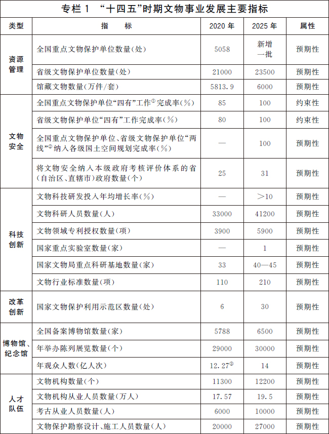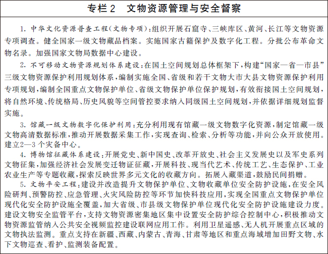 注:① “四有”工作是指劃定必要的保護范圍、作出標志說明、建立記錄檔案、設置專門機構或專人管理。 ?、?“兩線”是指保護范圍和建設控制地帶。 ③ 12.27億人次為2019年數(shù)據(jù),2020年受新冠肺炎疫情影響,年觀眾人數(shù)為5.4億人次。 展望2035年,我國將建成與文化強國建設目標相適應的文物保護管理工作體系,科技創(chuàng)新、人才隊伍建設有力支撐文物保護研究利用,考古成果實證我國一萬年的文化史、五千多年的文明史,博物館強國建設成效顯著,紅色基因得到有效傳承,根植于深厚歷史文化遺產的中華文化影響力大幅提升,民族文化自信顯著增強。 三、強化文物資源管理和文物安全工作 堅持以確保文物資源安全為核心,統(tǒng)籌做好各級各類文物資源管理工作,增強防護能力,加強執(zhí)法督察,嚴厲打擊和防范文物犯罪,守牢文物安全底線。 ?。ㄒ唬┙∪奈镔Y源管理體制。 完善文物登錄制度,健全文物調查、申報、認定、登記、定級、公布、降級和撤銷程序,梳理明確文物法定命名體系,建立國家文物資源總目錄并與中華文化資源普查工程做好銜接。完善不可移動文物資源管理機制,核定并公布第九批全國重點文物保護單位,推進根據(jù)文物普查、專項調查成果認定不可移動文物。在國土空間規(guī)劃中落實保護不可移動文物的空間管制措施,統(tǒng)籌劃定文物保護單位保護范圍和建設控制地帶、地下文物埋藏區(qū)、水下文物保護區(qū)等,納入國土空間規(guī)劃“一張圖”。完善可移動文物資源管理機制,健全博物館藏品征集、登記、定級機制,做好民間收藏文物調查,開展流失海外文物資源專項調查,優(yōu)化考古出土文物、涉案文物移交制度。開展革命文物資源調查。加強對軍隊文物、工業(yè)遺產、農業(yè)文化遺產、水利遺產、科技遺產的保護。由住房城鄉(xiāng)建設部牽頭,會同國家文物局進一步完善歷史文化名城名鎮(zhèn)名村、歷史文化街區(qū)、歷史建筑保護機制。 ?。ǘ┙ㄔO國家文物資源大數(shù)據(jù)庫。 系統(tǒng)整合全國不可移動文物資源數(shù)據(jù)庫、國有可移動文物普查數(shù)據(jù)庫、革命文物數(shù)據(jù)庫等,加強文物資源大數(shù)據(jù)應用。將文物資源空間信息納入國土空間基礎信息平臺。加強文物數(shù)字化保護,以世界文化遺產、全國重點文物保護單位、館藏一級文物等為重點,推進相關文物信息高清數(shù)據(jù)采集和展示利用。完善全國考古發(fā)掘信息管理系統(tǒng)。建立文物數(shù)字化標準規(guī)范體系,健全數(shù)據(jù)管理和開放共享機制,加大文物數(shù)據(jù)保護力度。支持國家和省級文物數(shù)據(jù)中心、重點文博單位信息基礎設施建設,加強文物領域新型基礎設施建設。 ?。ㄈ┙∪奈锇踩L效機制。 將文物安全工作全面納入地方各級政府考核評價體系,探索推行“文物長制”,建立健全文物安全責任體系,完善部門協(xié)作共商機制,加強信息共享,實施文物安全直接責任人公告公示制度。健全文物安全制度標準體系,提高安全防護設施建設和管理維護水平。建立重點文博單位安全風險評估和預警機制,實施風險等級管理,有效防范火災、人員擁擠踩踏等事故發(fā)生。加強文博單位治安防范,持續(xù)開展打擊文物犯罪專項行動,完善打擊和防范文物犯罪聯(lián)合長效機制。開展文物火災隱患排查整治行動和地震、地質災害、洪澇等方面的自然災害綜合風險排查,實施抗震加固、地質災害防控等工程,建立健全文物災害綜合風險監(jiān)測和評估制度,明確文物消防、防洪安全責任,加強消防設施、消防水源、消防車通道、防洪除澇設施和應急處置力量建設,強化火災、洪澇風險辨識與管控,推廣科學適用的技防物防措施,提升應急管理水平,增強防控能力。 ?。ㄋ模娀奈镄姓?zhí)法督察。 加強文物督察力量,開展國家文物督察試點,加大文物督察科技支撐力度,持續(xù)實施專項督察和聯(lián)合督察。強化省級文物行政部門督察職責,落實市、縣文化市場綜合執(zhí)法隊伍文物行政執(zhí)法責任,強化文物行政部門、文化市場綜合執(zhí)法隊伍執(zhí)法協(xié)作。完善文物行政執(zhí)法案例指導、案卷評查、行政執(zhí)法與刑事司法銜接、社會監(jiān)督機制。規(guī)范文物違法舉報流程,加大重大違法案件責任追究力度。 ?。ㄎ澹┨岣呶奈锇踩c執(zhí)法督察科技水平。 實施文物平安工程,加大古遺址、古墓葬、石窟寺石刻等防盜竊盜掘預警技術研發(fā)應用和相關裝備配置力度。加強博物館和文物建筑等火災防控、洪澇監(jiān)測預警、地震和地質災害防控信息技術應用和應急管理體系建設。加強衛(wèi)星遙感、無人機、大數(shù)據(jù)等科技手段在文物安全監(jiān)測和執(zhí)法督察中的應用。 四、全面加強文物科技創(chuàng)新 堅持科技創(chuàng)新引領,遵循文物保護和考古特點規(guī)律,加大要素投入力度,優(yōu)化資源配置,加強多學科協(xié)同,構建產學研用深度融合的文物科技創(chuàng)新體系,推進行業(yè)標準體系建設,提升文物科技創(chuàng)新能力和文物領域科技應用水平,帶動解決重點難點和瓶頸問題,支撐引領文物事業(yè)高質量發(fā)展。 ?。ㄒ唬┥罨A研究。 面向文物保護利用基礎理論需求、關鍵科學問題,部署基礎研究重點任務,促進數(