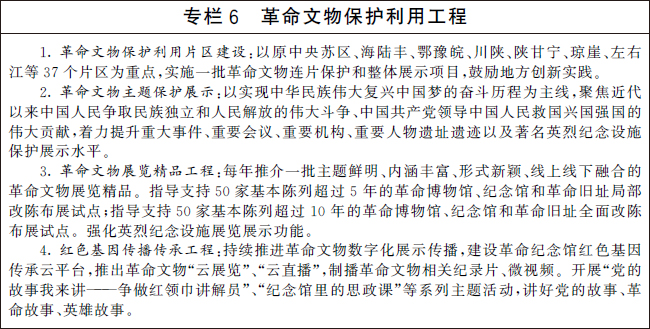 七、加強革命文物保護管理運用 堅持保護第一,充分發(fā)揮革命文物在黨史學習教育、革命傳統(tǒng)教育、愛國主義教育等方面的重要作用,用好紅色資源、賡續(xù)紅色血脈、弘揚革命文化、汲取奮進力量。 ?。ㄒ唬┘哟蟾锩奈锉Wo力度。 系統(tǒng)開展革命文物和相關史料調查征集。加強科學保護、系統(tǒng)保護,進一步完善革命文物定期排查、日常養(yǎng)護管理和安全防范制度,實施一批革命舊址維修保護項目、館藏革命文物保護修復項目和革命文物研究性保護項目。加強整體保護,推進革命文物保護利用片區(qū)整體規(guī)劃、連片保護、統(tǒng)籌展示,發(fā)揮示范引領作用。持續(xù)改善各級各類不可移動革命文物保存狀況。 ?。ǘ┨嵘锩奈镎故舅?。 優(yōu)化革命博物館、紀念館區(qū)域布局,指導支持一批革命博物館、紀念館展陳提升項目,加強中國共產黨歷史文物保護展示。認真總結慶祝中國共產黨成立100周年革命文物陳列展覽成功經驗,結合紀念辛亥革命110周年、紅軍長征勝利85周年、中華人民共和國成立75周年、中國人民抗日戰(zhàn)爭勝利80周年、中國人民志愿軍抗美援朝出國作戰(zhàn)75周年等重要時間節(jié)點,堅持政治性思想性藝術性相統(tǒng)一,策劃推出革命文物陳列展覽精品。合理運用現(xiàn)代科技手段,增強革命文物陳列展覽表現(xiàn)力、傳播力、影響力。推進革命文物聯(lián)展巡展。 (三)強化革命文物研究闡釋。 整合文物、黨史、軍史、檔案、地方志等方面研究力量,加強革命文物保護利用研究,開展實物、文獻、檔案、史料和口述史征集,挖掘革命文物深刻內涵,推出重要研究成果,旗幟鮮明反對和抵制歷史虛無主義,繼續(xù)發(fā)揚偉大建黨精神,傳承弘揚井岡山精神、長征精神、遵義會議精神、延安精神、西柏坡精神、紅巖精神、抗美援朝精神、“兩彈一星”精神、特區(qū)精神、抗洪精神、抗震救災精神、抗疫精神、脫貧攻堅精神等偉大精神。 ?。ㄋ模┩卣垢锩奈镞\用方式。 提升革命舊址開放水平,完善重要革命紀念地設施。用好革命文物資源,舉辦國家和群眾性紀念活動,積極開展青少年教育活動。創(chuàng)新革命文物宣傳傳播方式,加強革命文物資源網絡空間建設。依托革命文物資源開辟公共文化空間,發(fā)展紅色旅游及紅色研學旅行,打造紅色經典景區(qū)和精品線路,助力鄉(xiāng)村振興和革命老區(qū)振興發(fā)展。 ?。ㄎ澹┥罨锩奈锕ぷ鲀热?。 服務好“四史”學習教育,特別是圍繞中國共產黨各個歷史時期的重大事件、重要節(jié)點,研究確定一批重要標識地,推動有條件的重要建設工程、科學工程、國防工程面向公眾開放,生動展示革命文物蘊含的強大精神力量。 八、激發(fā)博物館創(chuàng)新活力 堅持公益屬性,突出社會效益,統(tǒng)籌不同地域、層級、屬性、類型博物館發(fā)展,提高博物館公共服務均等化、便捷化、多樣化水平,做好常態(tài)化疫情防控工作,不斷推進博物館改革發(fā)展。 ?。ㄒ唬﹥?yōu)化博物館布局。 實施中國特色世界一流博物館創(chuàng)建計劃。支持省級、重要地市級博物館特色化發(fā)展。盤活基層博物館資源。探索建立行業(yè)博物館聯(lián)合認證、共建共管機制。規(guī)范和扶持非國有博物館發(fā)展,落實支持政策,依法依規(guī)推進非國有博物館法人財產權確權。認真履行相關審批程序,有序推動建設一批反映黨和國家建設成就的當代主題博物館和行業(yè)博物館,重點支持建設反映中華文明發(fā)展歷程的國家級重點專題博物館,倡導建設特色專題博物館。探索在文化資源豐厚地區(qū)建設“博物館之城”。 ?。ǘ┖粚嵅┪镳^藏品保護管理基礎。 提升博物館藏品管理能力,健全藏品登錄機制,推進藏品檔案標準化、信息化建設,逐步推廣藏品電子標識。實施館藏珍貴瀕危文物、材質脆弱文物保護修復計劃,寓科學研究于保護修復全過程,提高館藏文物保護修復水平。強化預防性保護,充分運用科學研究成果和環(huán)境監(jiān)測數(shù)據(jù),改善博物館藏品保存環(huán)境,推動多元化、低成本、高效能的藏品保存設施設備體系建設。加快推進博物館藏品數(shù)字化,完善藏品數(shù)據(jù)庫,加大基礎信息開放力度。 (三)提升博物館服務能力。 提升博物館展陳質量,加強對藏品價值的挖掘闡發(fā)。支持博物館聯(lián)合辦展、巡回展覽、流動展覽、網上展覽。探索獨立策展人制度,推出更多原創(chuàng)性主題展覽。推介“弘揚中華優(yōu)秀傳統(tǒng)文化、培育社會主義核心價值觀”主題展覽。廣泛深入開展在博物館里過傳統(tǒng)節(jié)日、紀念日活動。制定博物館教育服務標準,豐富博物館教育課程體系,支持大中小學利用博物館開展研學實踐和科普活動等。實施一批智慧博物館建設示范項目,研究制定相關標準規(guī)范。推動博物館發(fā)展線上數(shù)字化體驗產品,提供沉浸式體驗、虛擬展廳、高清直播等新型文旅服務。 ?。ㄋ模﹦?chuàng)新博物館管理體制機制。 進一步健全博物館免費開放機制。分類推進國有博物館、非國有博物館理事會制度建設,建立健全決策執(zhí)行和監(jiān)督咨詢機制。對于部分符合條件的新建博物館,在不改變藏品權屬、確保安全的前提下,經批準可探索開展國有博物館資產所有權、藏品歸屬權、開放