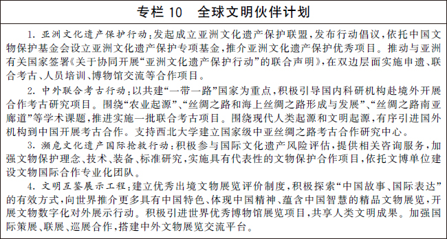 十一、加強文物國際交流合作 堅持以我為主、兼收并蓄,完善文物國際交流合作機制,創(chuàng)新成果轉化路徑和傳播推介方式,推動文物國際交流合作成為共建“一帶一路”的重要抓手和載體,向全世界講好中國故事,促進中外文明交流互鑒。 (一)服務國家外交戰(zhàn)略大局。 推動文物國際交流合作有機融入國家外交、國際傳播、對外援助頂層設計,加強統(tǒng)籌協(xié)調,優(yōu)化資源力量配置。深化與共建“一帶一路”國家在文物保護修復、考古、博物館、學術研究、人員培訓等領域交流合作,推進柬埔寨吳哥古跡、尼泊爾九層神廟、緬甸他冰瑜佛塔等文物保護修復合作項目,持續(xù)開展中外聯(lián)合考古。實施亞洲文化遺產保護行動,構建常態(tài)化合作機制和交流平臺,聯(lián)合實施一批土遺址、木結構建筑、紙質文物、絲織品保護等亞洲主題合作項目。鼓勵國內相關機構與海外研究機構聯(lián)合開展早期文明比較研究。 ?。ǘ┘訌妵H傳播能力建設。 打造文物對外宣傳品牌,向國際社會展示博大精深的中華文明,講清楚中華文明的燦爛成就和對人類文明的重大貢獻。加強中外文物展覽交流合作,組織策劃精品出境展覽,積極引進優(yōu)秀外展。運用數(shù)字化技術,融合線上線下傳播方式,充分利用香港、澳門在中外文化交流中的優(yōu)勢,發(fā)揮國家海外文化陣地積極作用,推動與國外文物機構共建合作傳播基地,提升國際文化傳播效能。 ?。ㄈ┥疃葏⑴c文化遺產國際治理。 深化在瀕危文化遺產搶救保護、打擊文化財產非法販運、武裝沖突地區(qū)文化遺產保護、水下文物保護、世界文化遺產管理、流失文物追索返還、博物館等領域的國際合作,積極履行國際責任,提升中國話語權。打造文化遺產國際智庫,加強專業(yè)人才培養(yǎng)。