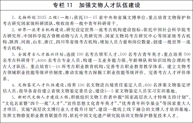 十二、壯大文物人才隊伍 堅持文物保護只能加強、不能削弱的原則,綜合施策推動構建與文物資源規(guī)模、文物保護利用任務相匹配的學科結構、管理機構和專業(yè)隊伍,不斷健全文博人才培養(yǎng)體系,創(chuàng)新人才機制,弘揚踐行“莫高精神”,讓文物事業(yè)后繼有人、人才輩出。 ?。ㄒ唬┩七M文物和考古學科專業(yè)建設。 梳理文物領域學科框架,完善文物學科體系、學術體系、話語體系。加強文物科學與技術相關學科建設,開展文物科技創(chuàng)新研究。推動考古相關學科專業(yè)建設和課程建設,通過“國家關鍵領域急需高層次人才培養(yǎng)專項招生計劃”對考古等相關專業(yè)給予積極支持,推動有條件的高等院校適當擴大考古相關專業(yè)設置和招生規(guī)模,建設一批一流考古學專業(yè)。在國家社會科學基金中加大對文物考古研究的支持力度,設立系列研究課題。在國家自然科學基金融合科學領域增設“文物保護科學”方向。大力發(fā)展文物修復與保護、文物考古技術、文物展示利用技術、石窟寺保護技術等職業(yè)教育專業(yè),引導文博單位深度參與職業(yè)教育,鼓勵校企共建實習實訓基地,支持文物領域大師、名師、工匠進校園參與教育教學活動。 (二)構建多層次文物人才培養(yǎng)體系。 培育一批以領軍人才和中青年骨干創(chuàng)新人才為重點的高層次文物人才,加強考古、科技創(chuàng)新、文物鑒定、文物修復、文物展覽等急需領域人才培養(yǎng),加快建設一支門類齊全、技藝精湛的文物技能人才隊伍,穩(wěn)步造就一支科技研發(fā)能力和技術應用能力過硬的文物科技人才隊伍,錘煉一支熟悉專業(yè)、素質優(yōu)良的文物管理人才隊伍。加強相關行業(yè)文物保護人才培養(yǎng)。 (三)激發(fā)文物人才創(chuàng)新活力。 關心愛護文物工作者,完善人才激勵機制,支持鼓勵更多優(yōu)秀專業(yè)人才和青年人才從事文物保護研究。建立健全管理規(guī)范、評價科學、激勵有效的文物人才體系。實行更加積極開放的人才政策,多渠道招聘引進高層次人才,創(chuàng)新文物技能型人才聘用方式。推動文博單位建立體現(xiàn)創(chuàng)新要素價值的收益分配機制。按照國家有關規(guī)定,對有杰出貢獻的文物工作者予以表彰獎勵。 ?。ㄋ模┙◤娢奈餀C構隊伍。 進一步加強各級文物保護和考古隊伍建設,擴大考古發(fā)掘資質單位數(shù)量,根據(jù)文物資源密集度,核定并落實文物保護和考古專業(yè)人員配置量化標準。持續(xù)加強基層文物保護研究隊伍建設,保持隊伍穩(wěn)定。支持社會力量參與,構建多渠道基層文物保護看護機制。統(tǒng)籌現(xiàn)有資源,加強科研類文博單位建設,打造一批文物保護研究和傳承利用高地。