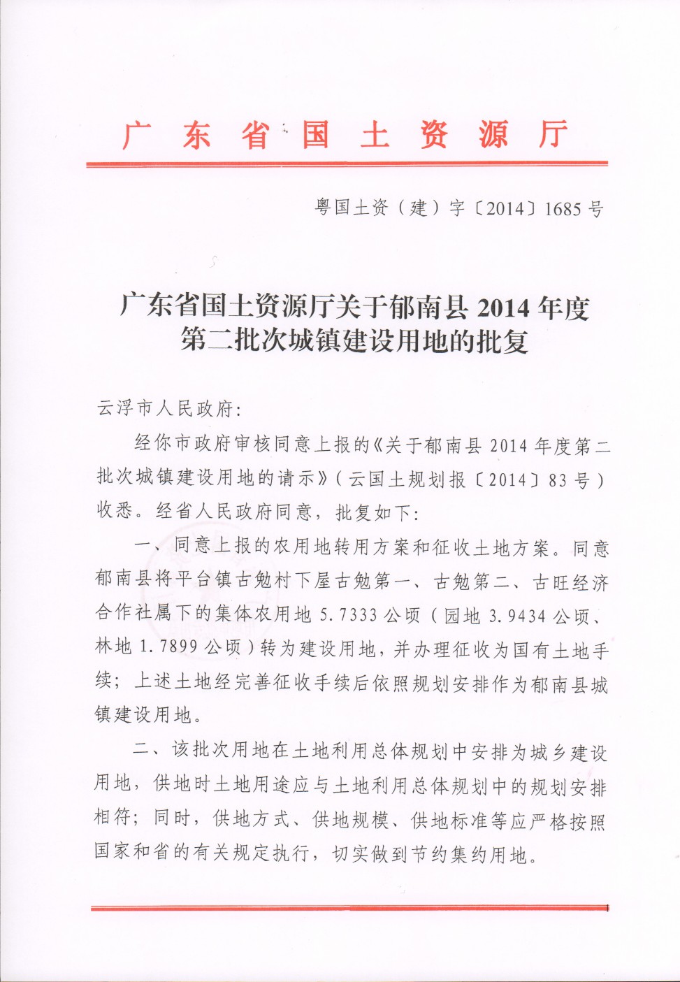 廣東省國(guó)土資源廳關(guān)于郁南縣2014年度第二批次城鎮(zhèn)建設(shè)用地的批復(fù)