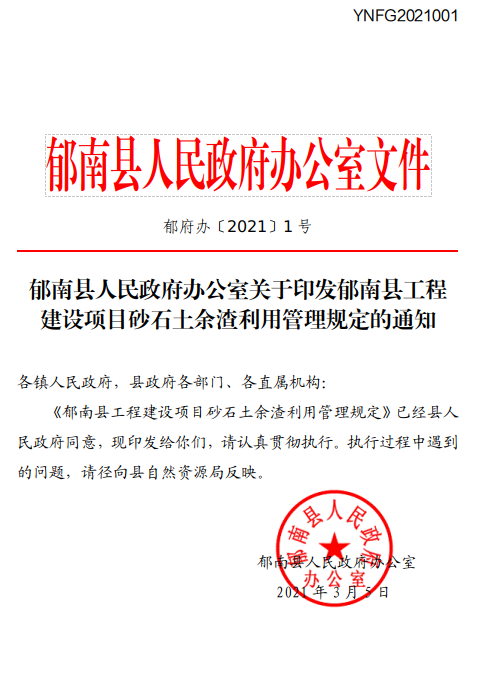 (YNFG2021001)郁南縣人民政府辦公室關(guān)于印發(fā)郁南縣工程建設(shè)項(xiàng)目砂石土余渣利用管理規(guī)定的通知(郁府辦〔2021〕1號(hào))