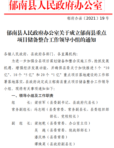 郁南縣人民政府辦公室關(guān)于成立郁南縣重點(diǎn)項(xiàng)目儲(chǔ)備整合工作領(lǐng)導(dǎo)小組的通知(郁府辦函〔2021〕19號(hào))