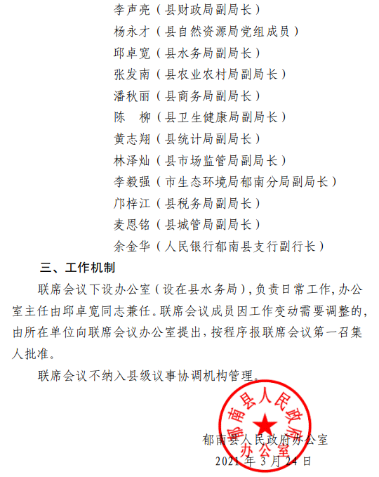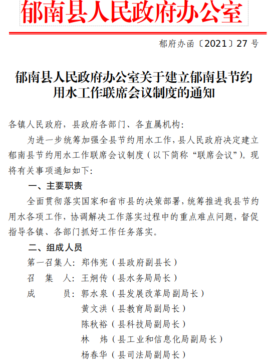 郁南縣人民政府辦公室關(guān)于建立郁南縣節(jié)約用水工作聯(lián)席會議制度的通知(郁府辦函〔2021〕27號)